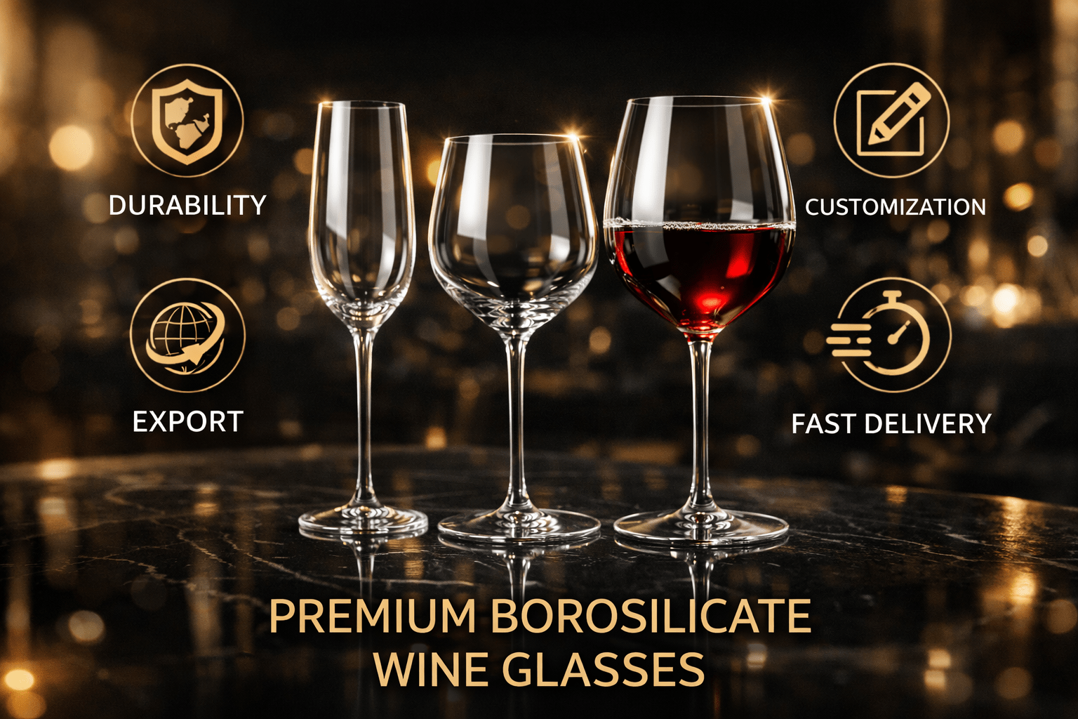 At R3 Exports, we manufacture and export high-grade borosilicate wine glasses that deliver exceptional clarity, strength, and lightweight balance — making them ideal for both luxury hospitality and retail brands.